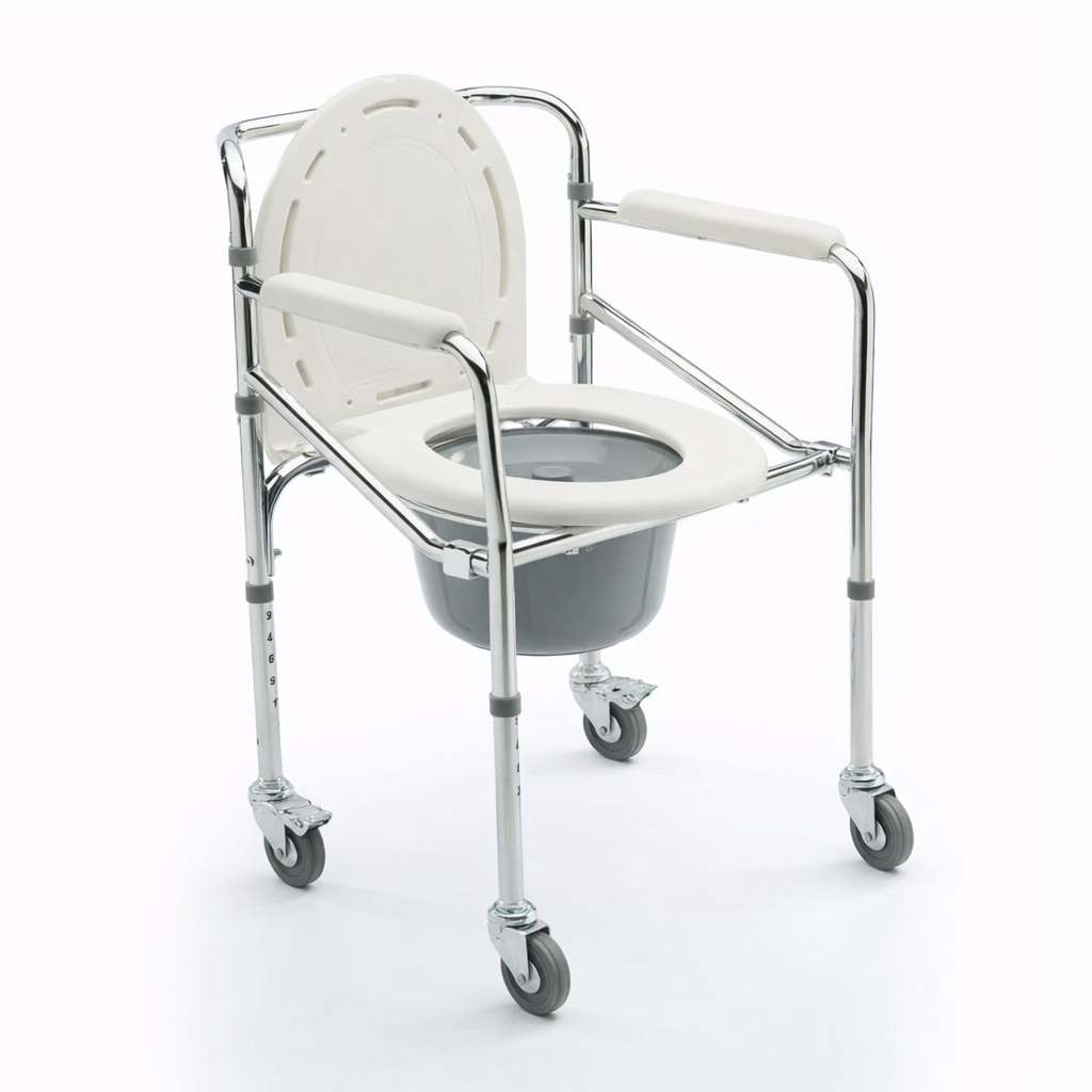 Gracias a su diseño móvil, facilita el traslado del usuario, mientras que los frenos en dos ruedas aseguran estabilidad durante su uso. Incorpora apoyabrazos plásticos y un asiento cómodo, ofreciendo una solución funcional tanto para el hogar como para centros de cuidado.